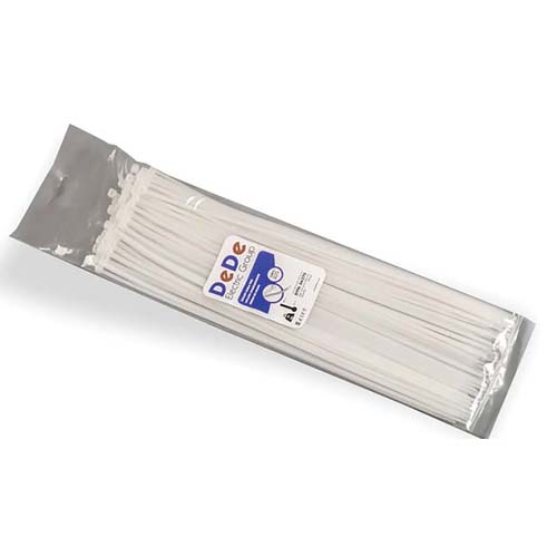 بست کمربندی 20 سانت سفید رنگ پلاستیکی با طول 20 سانت و عرض 2.5mm بسته 100 عددی با کیفیت مرغوب.برند محصول dede است.